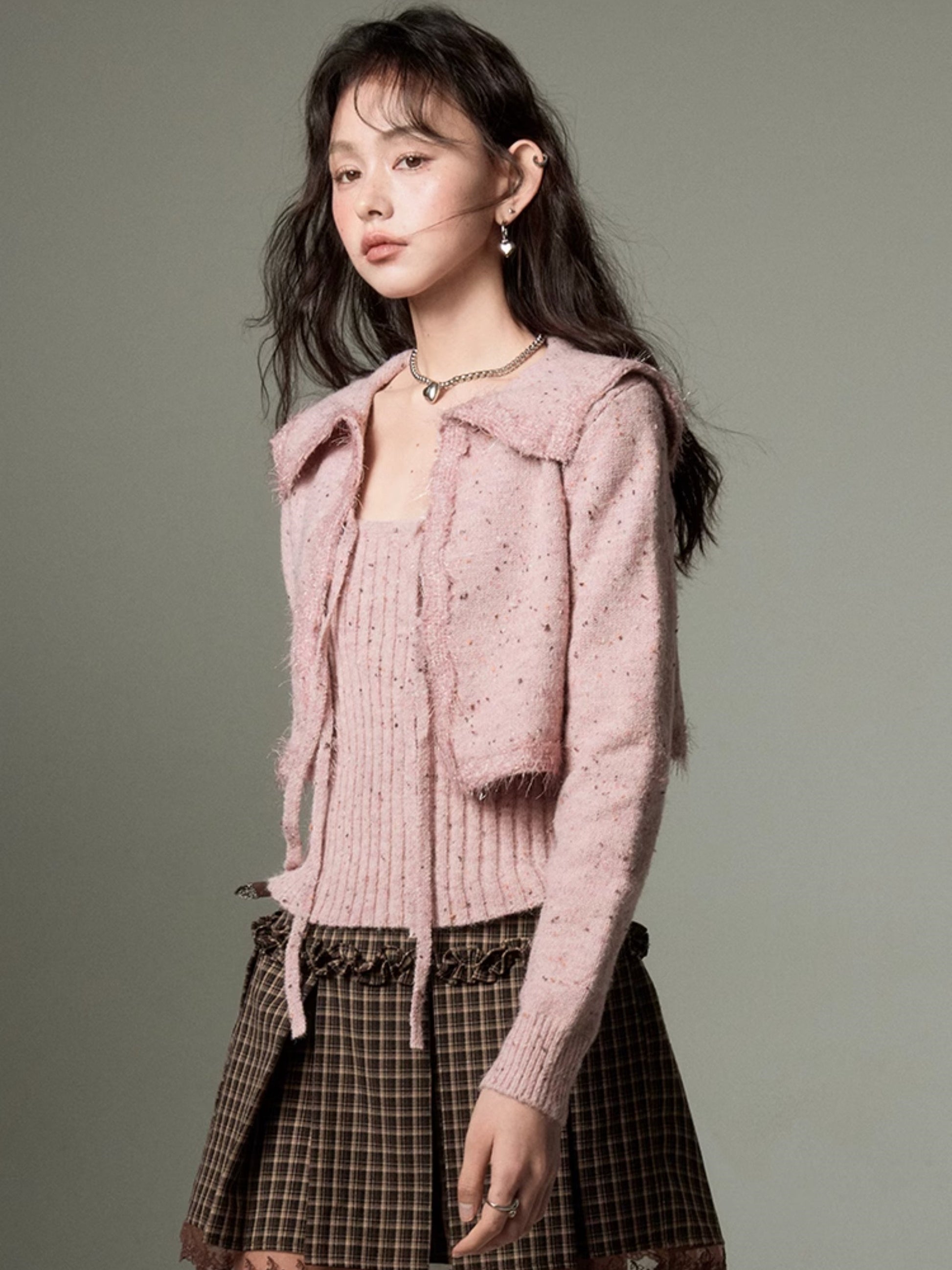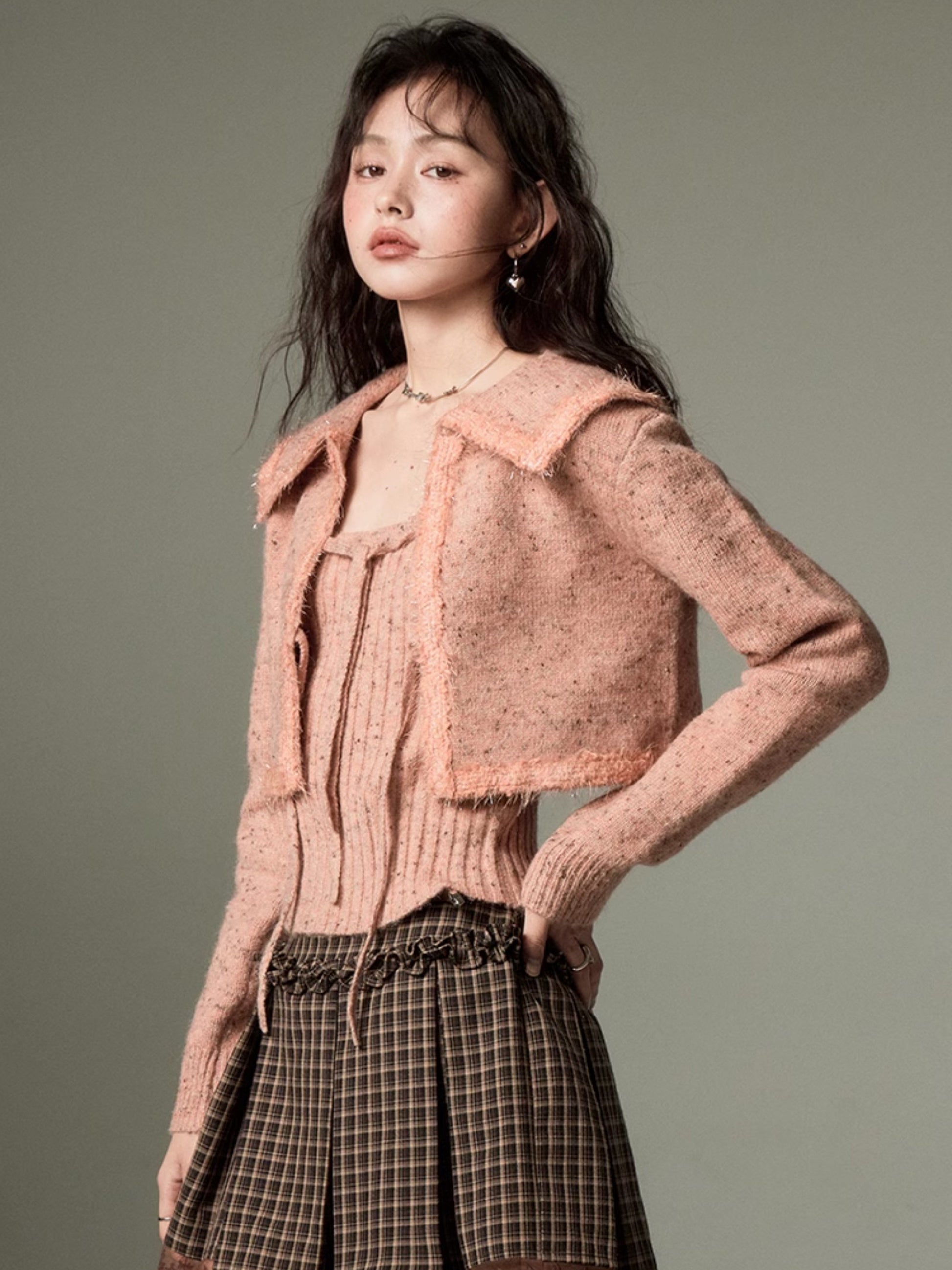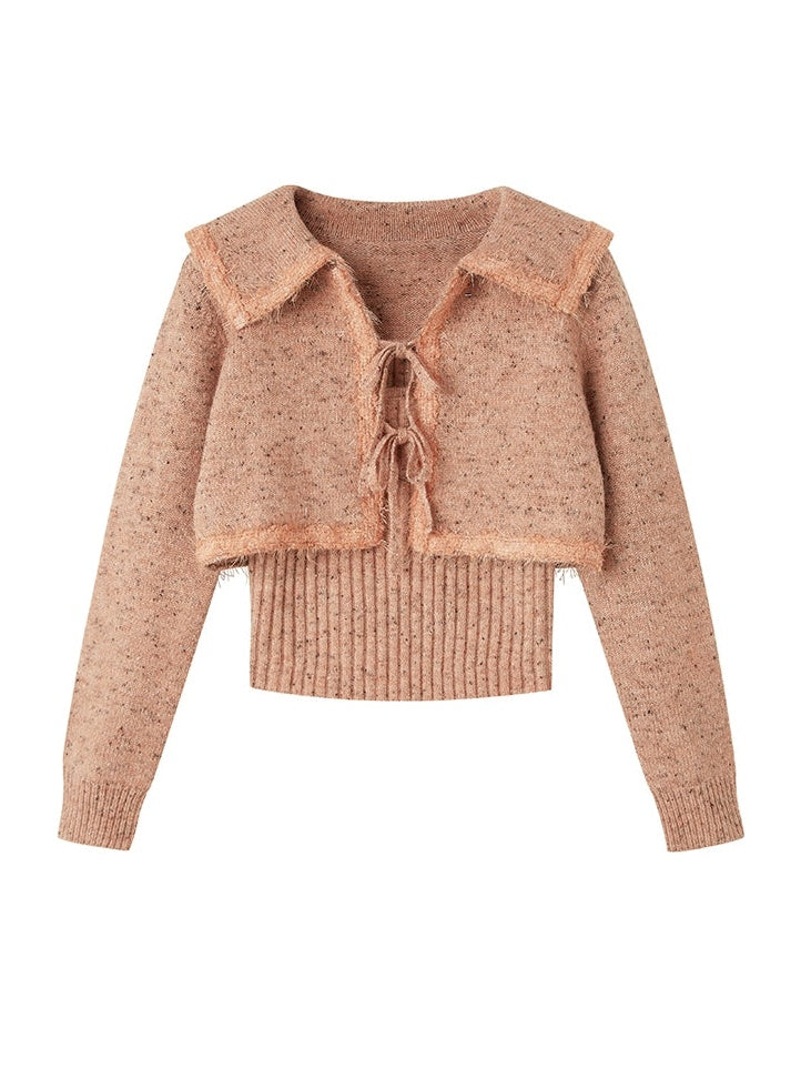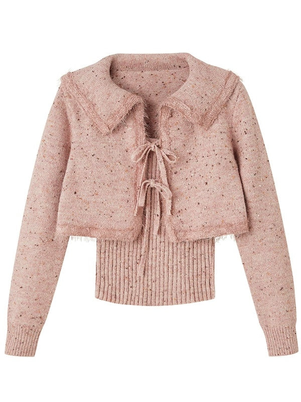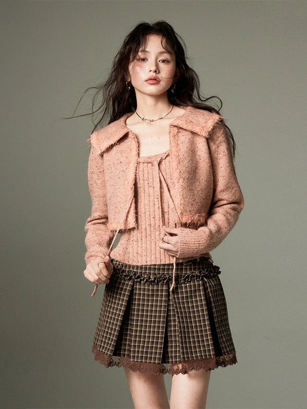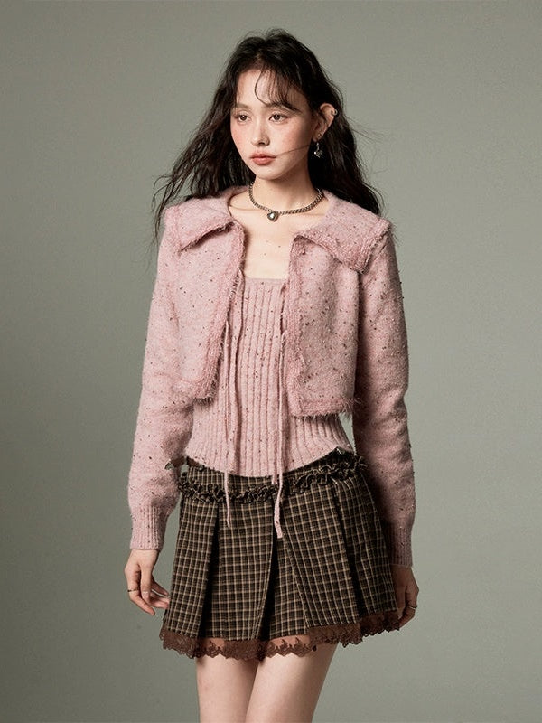 Big Collar Cropped Knitted Cardigan & Camisole Set-up