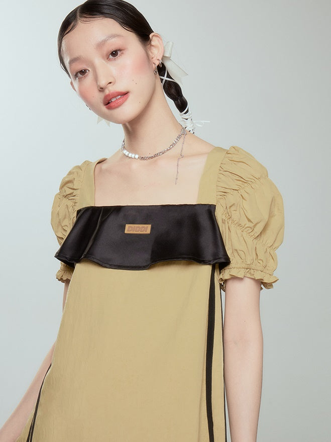 Puff-sleeve Crumply Bi-color Retro One-piece