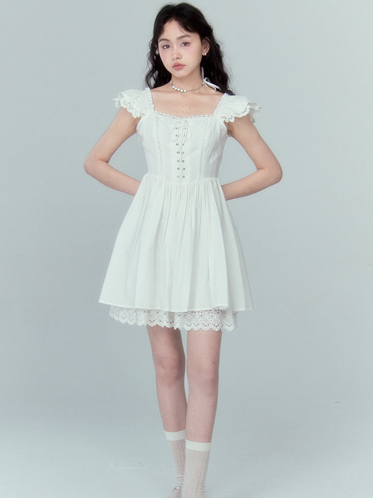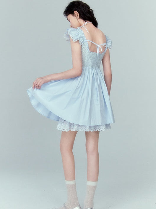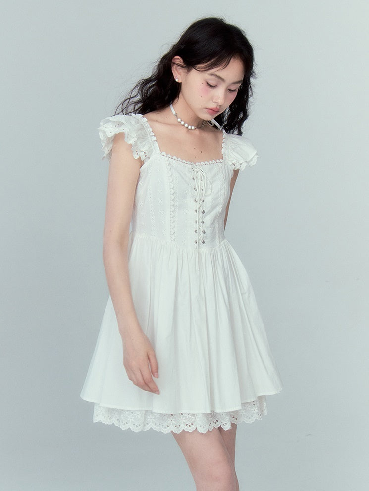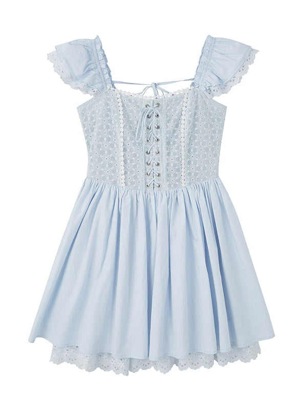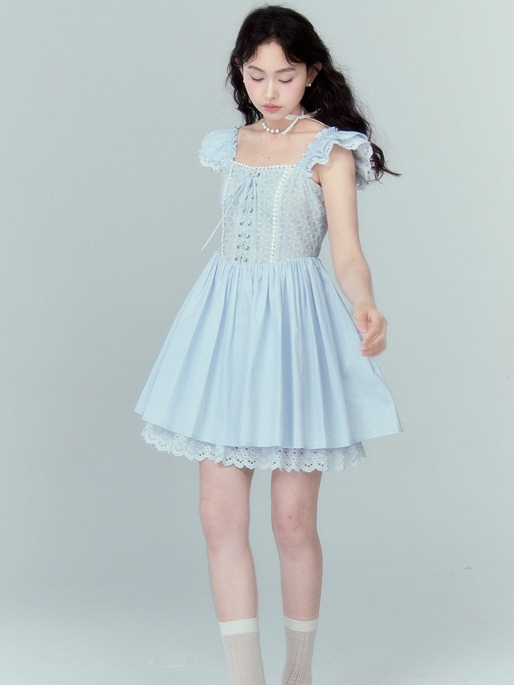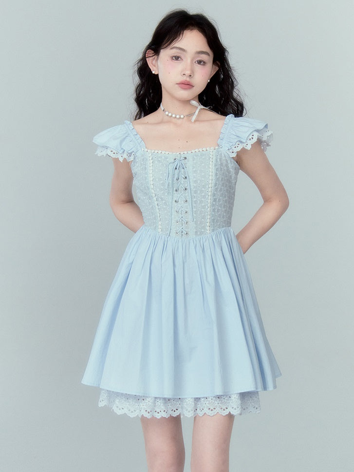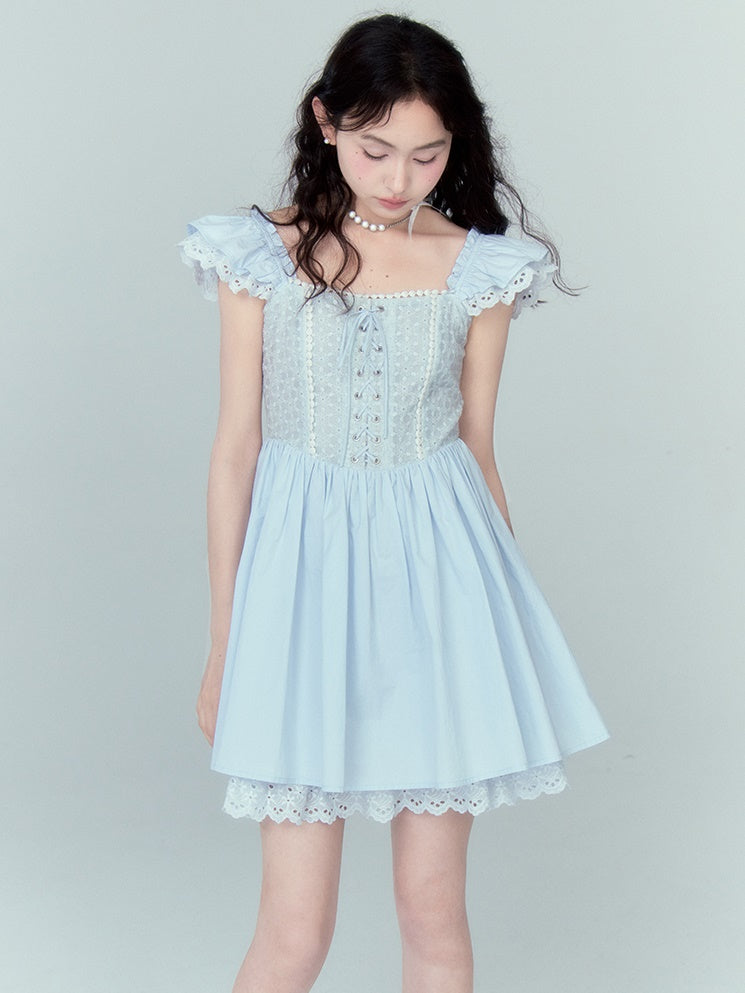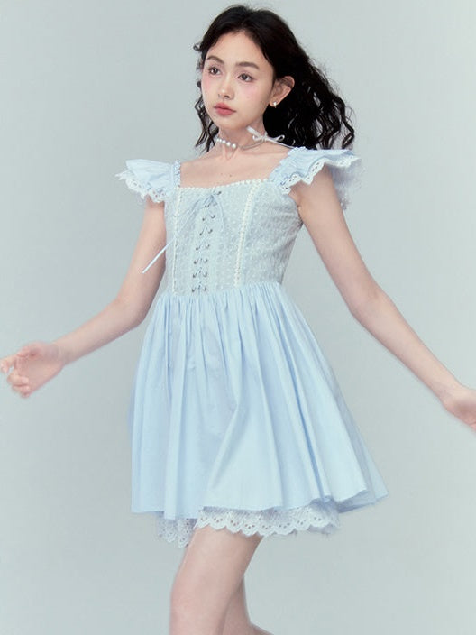 Stitching Lace Jacquard Flying Sleeve Dress