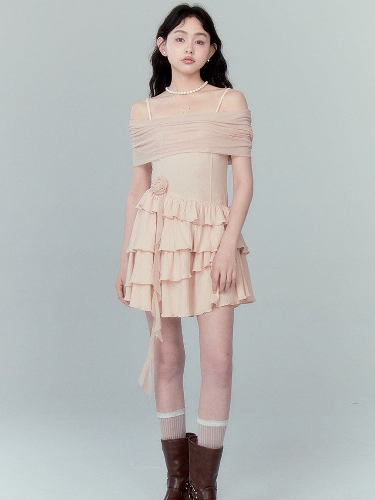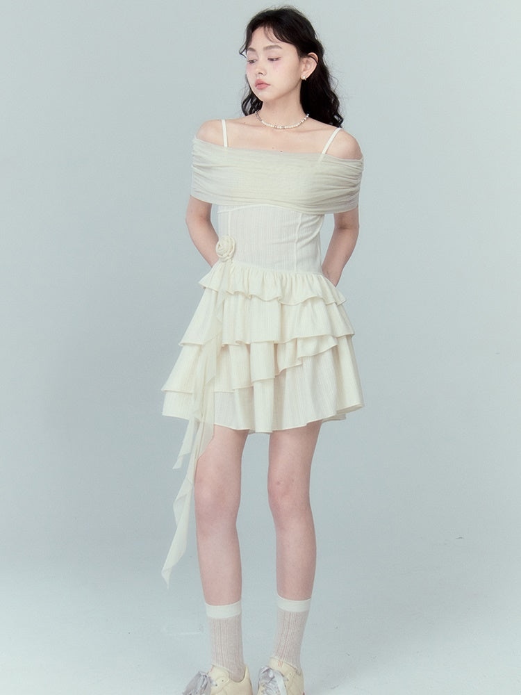 Strap Off-shoulder Ruffle Stitching Dress