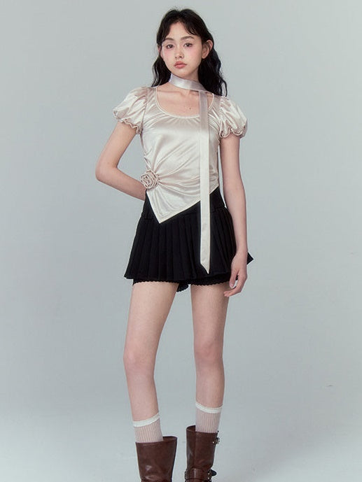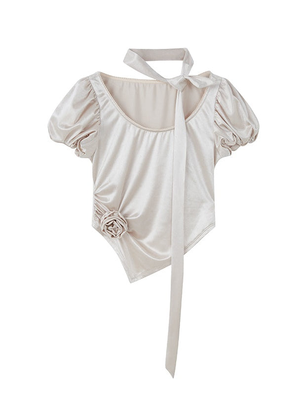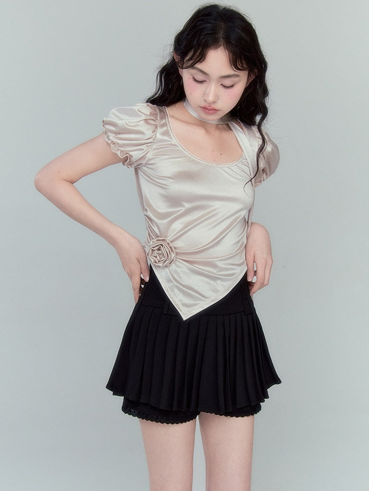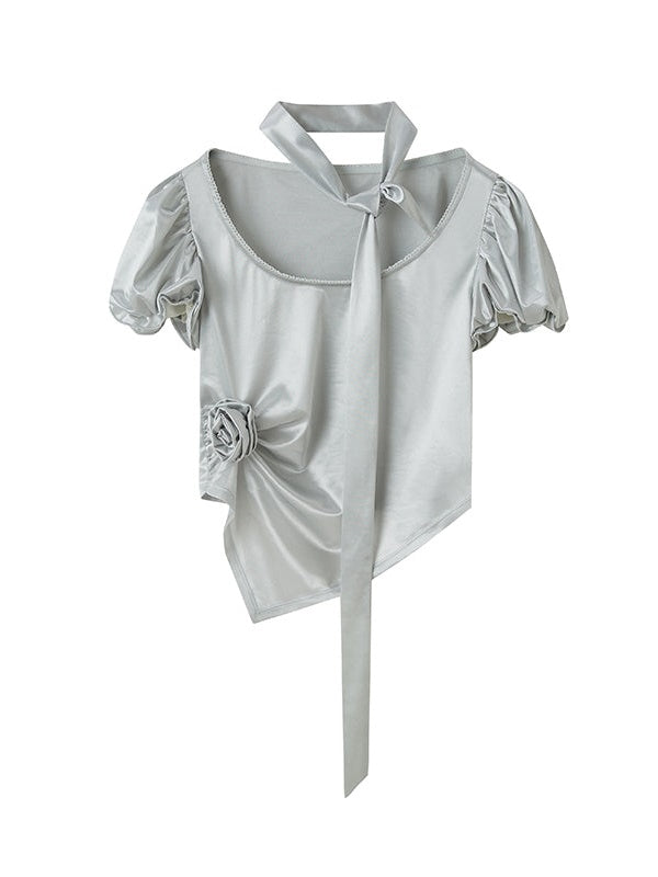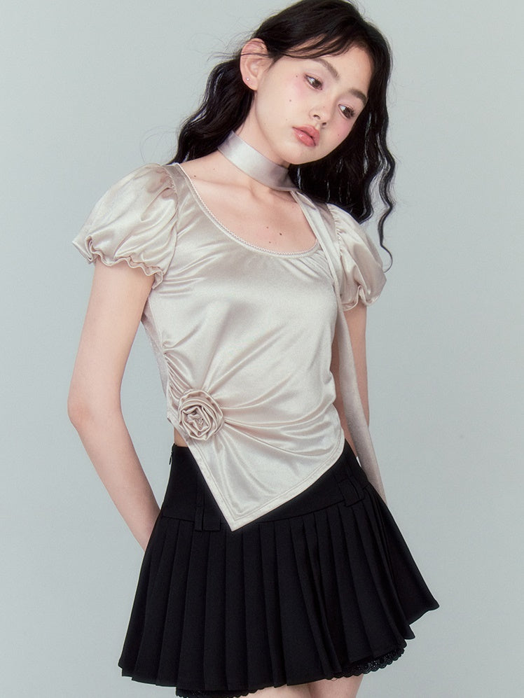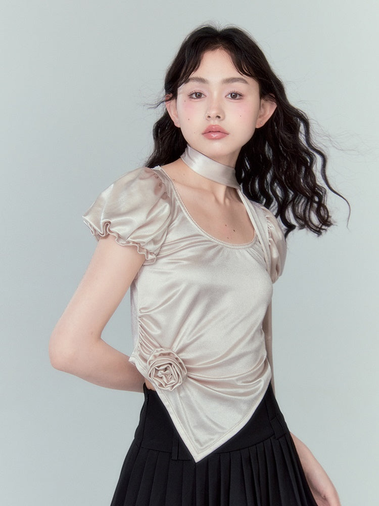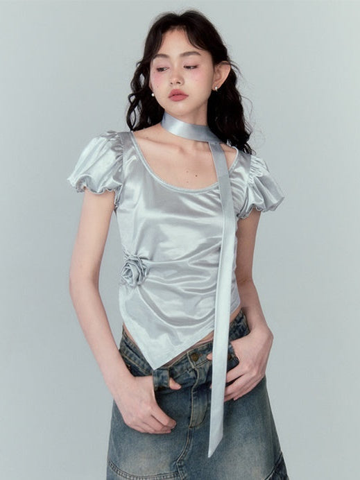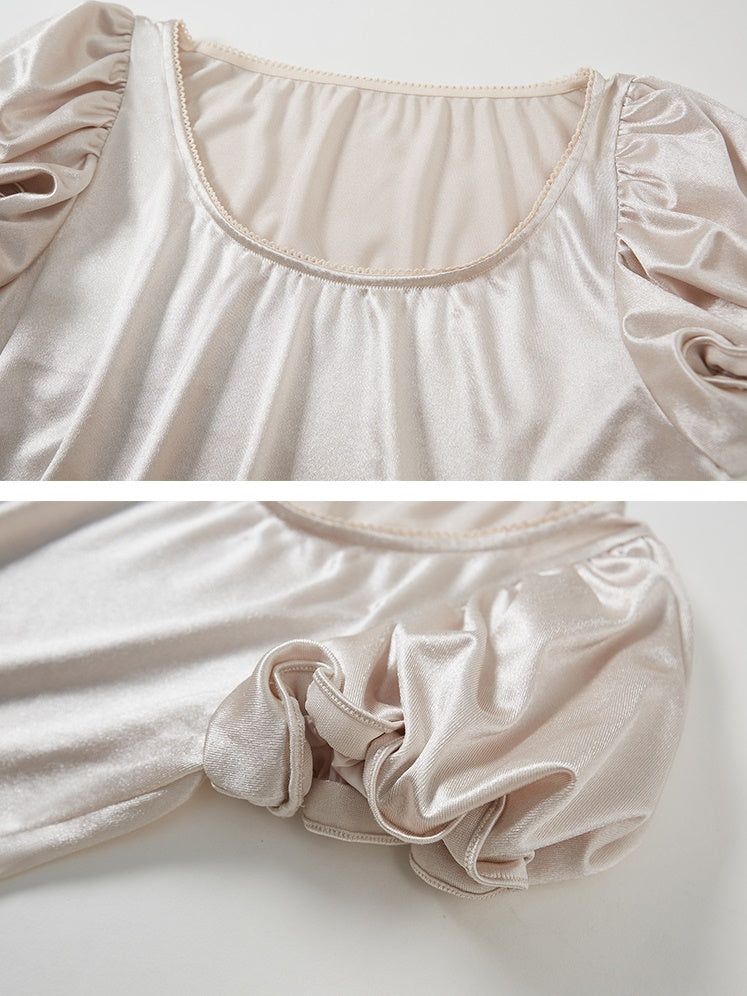 Wrinkled Bud Sleeve Short-sleeved Satin Top